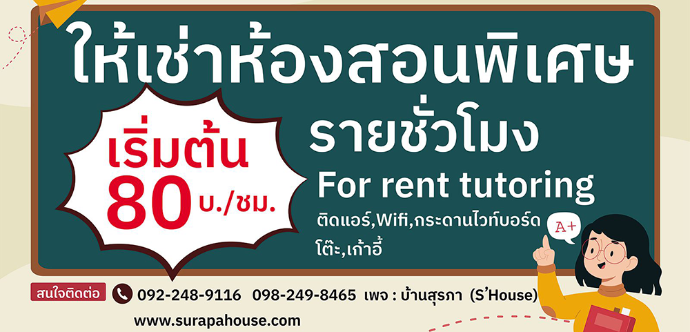 พิเศษ….สำหรับครู ติวเตอร์ที่มาเช่าห้องสอน จะประชาสัมพันธ์วิชาที่ท่านสอนให้ฟรี ในเว็บไซต์และเพจบ้านสุรภา โดยเราจะเป็นตัวกลาง ให้คุณครูและผู้ปกครอง/นักเรียนได้พบกันโดยตรง