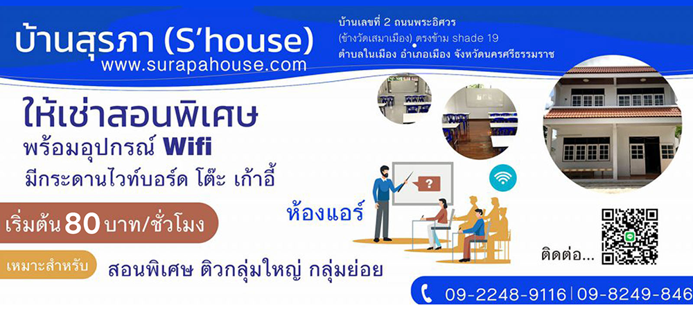 บ้านสุรภา…..ให้เช่าสอนพิเศษ รายชั่วโมง รวม 5 ห้องเรียน พร้อมอุปกรณ์สำหรับการเรียนการสอน ในสถานที่กว้างขวาง